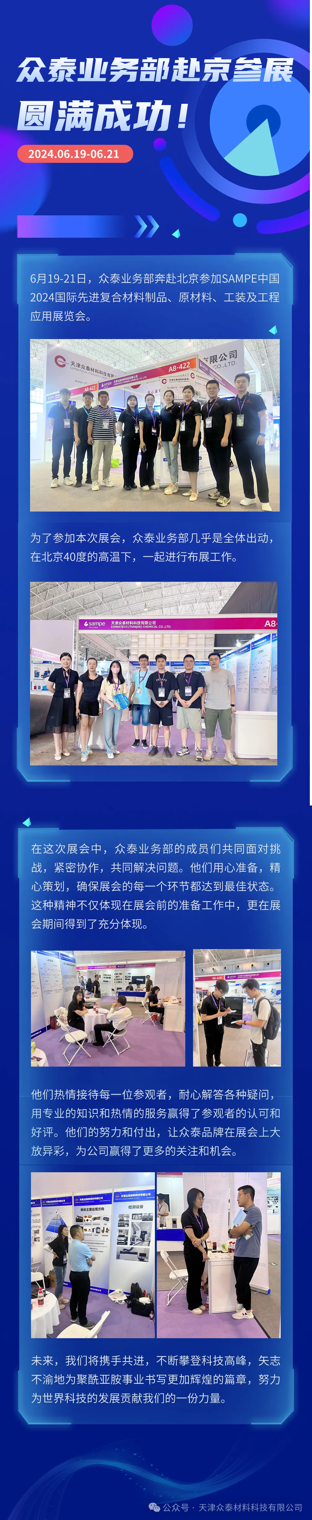 6月19日-21日,眾泰業(yè)務(wù)部奔赴北京參加SAMPE中國2024國際先進(jìn)復(fù)合材料制品、原材料、工裝及工程應(yīng)用展覽會(huì)。在這次展會(huì)中,眾泰業(yè)務(wù)部的成員們共同面對(duì)挑戰(zhàn),緊密協(xié)作,共同解決問題。